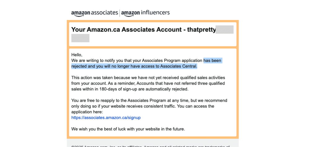 It also wasn’t smooth. My Amazon Associates account was initially cancelled after six months because I didn’t make any sales. I reapplied right away, and the second time, my account was approved for both Canada and the U.S. and that’s when sales started coming in.